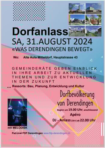 Der Vorstand der FDP.Die Liberalen Derendingen wünscht allen Derendingerinnen und Derendingern ein frohes und neues Jahr und lädt ein zum Neujahrsapéro am 24. Januar 2025, ab 17:00 Uhr, auf dem Pestalozziplatz.